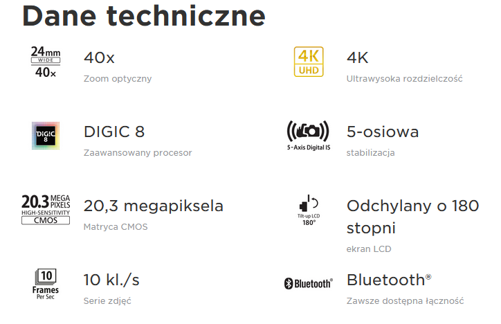 Niewielki podróżny model zmiennoogniskowy z flagowej serii z dużym, 40-krotnym zoomem optycznym i funkcją nagrywania zachwycających filmów 4K.
